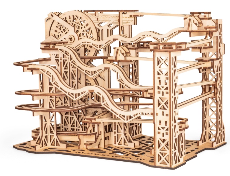 Конструктор объединяет в единую подвижную систему из захватывающих трека с резкими поворотами, ступеньками, качелями и спускам. Треки в модели являются цикличными. Беспрерывную работу деревянного конструктора обеспечивает подъемник - запущенный шар преодолеет все преграды и вновь поднимется на высоту. В комплект входят 15 металлических шариков, которые движутся последовательно друг за другом, поднимаются вверх и затем расходятся по разным трекам, создавая увлекательное зрелище, погружающее в мир технического удовольствия.
