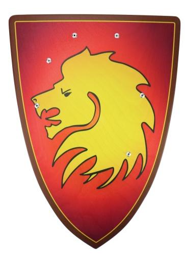 Детский щит треугольный изготовлен из березовой фанеры с рукояткой из натуральной кожи. Отшлифован и покрашен. Не имеет заусенцев и готов к игре.