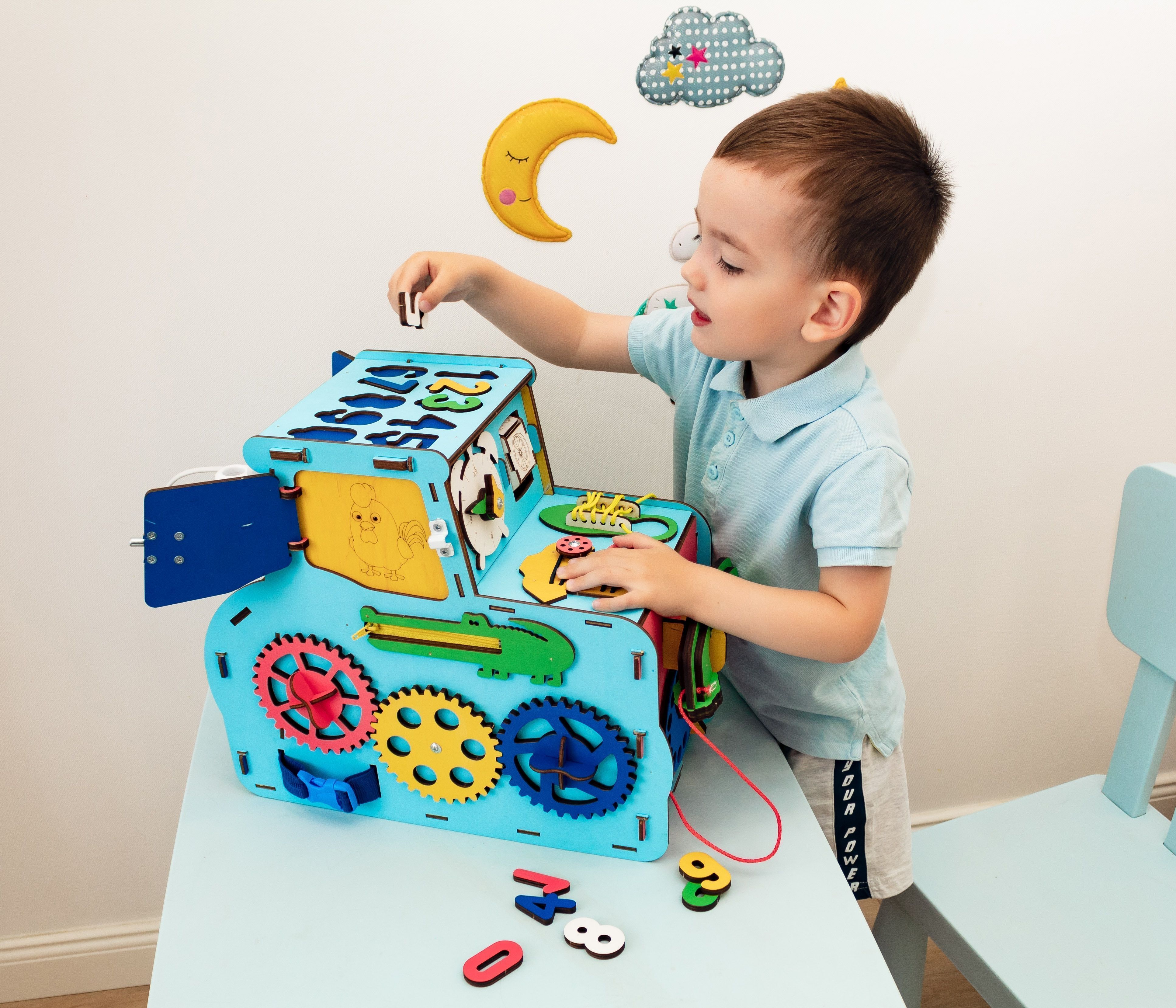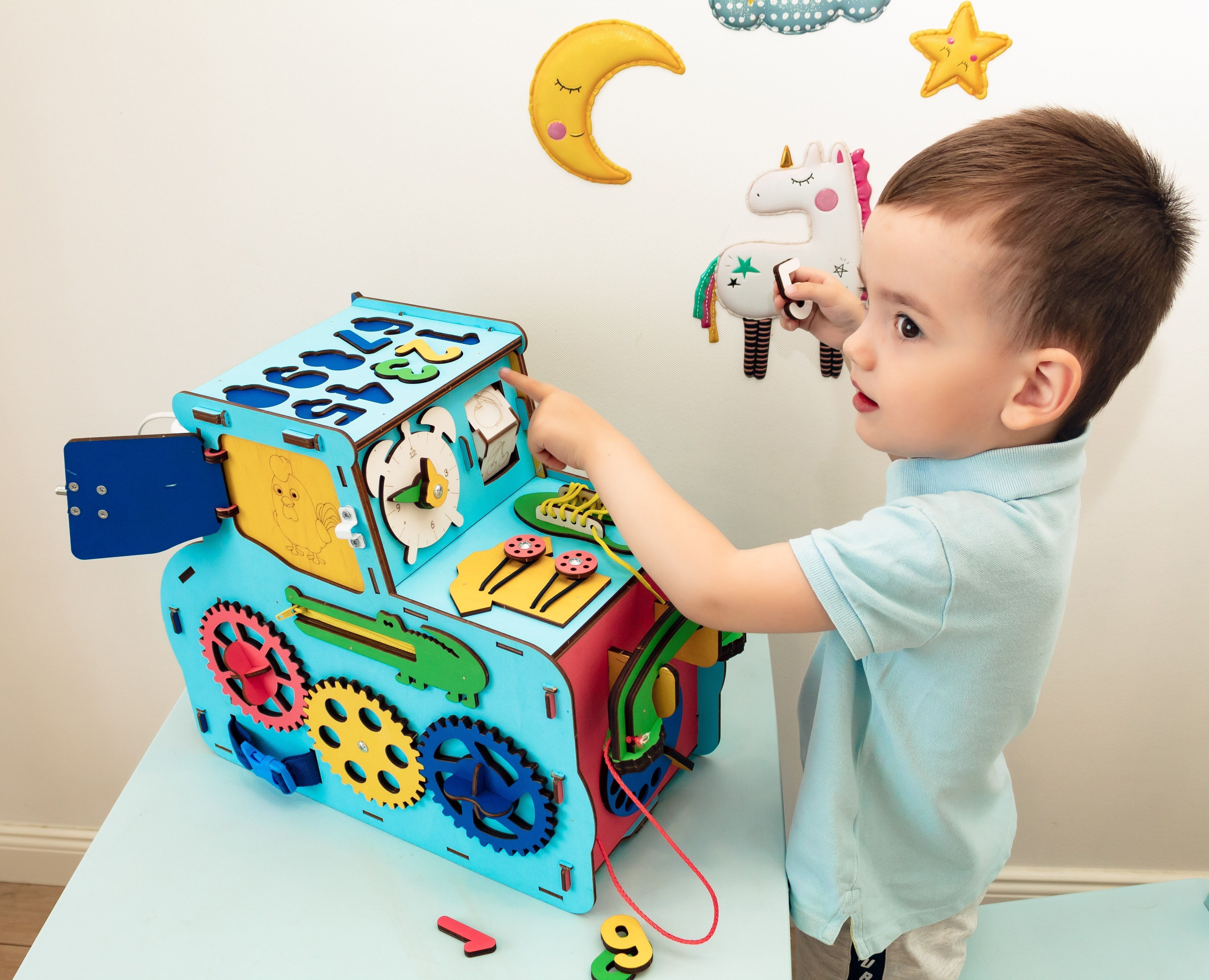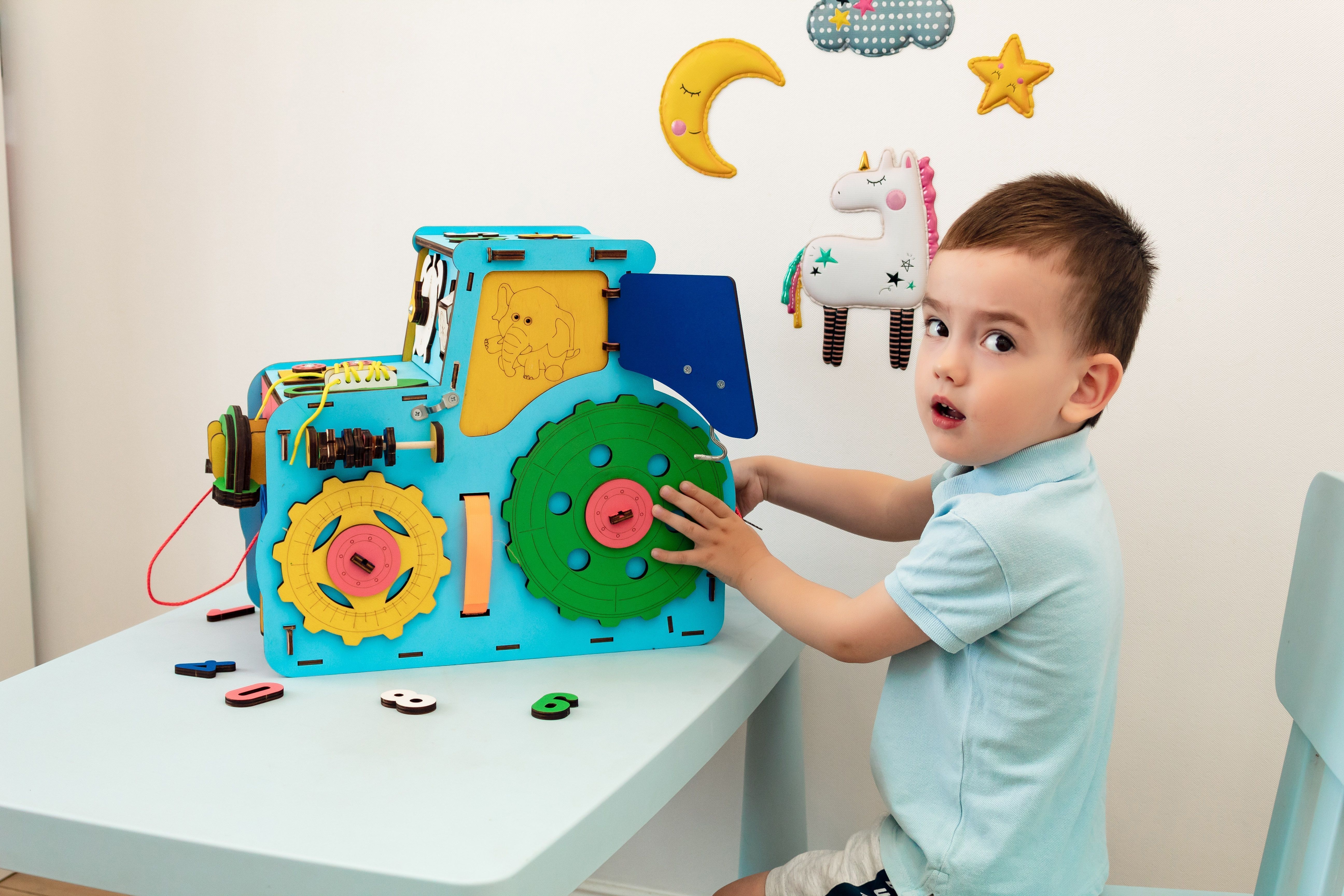 Игрушка развивающая Бизиборд из дерева — деревянный Трактор поможет вашим деткам увлекательно и, главное, безопасно исследовать этот мир. Это просто кладезь полезных и занимательных упражнений для малыша, которые способствуют развитию логического мышления, воображения и фантазии, усидчивости, а также помогают постепенно адаптироваться к бытовой среде. И самое главное, бизиборд незаменим для развития и тренировки мелкой моторики малышей.