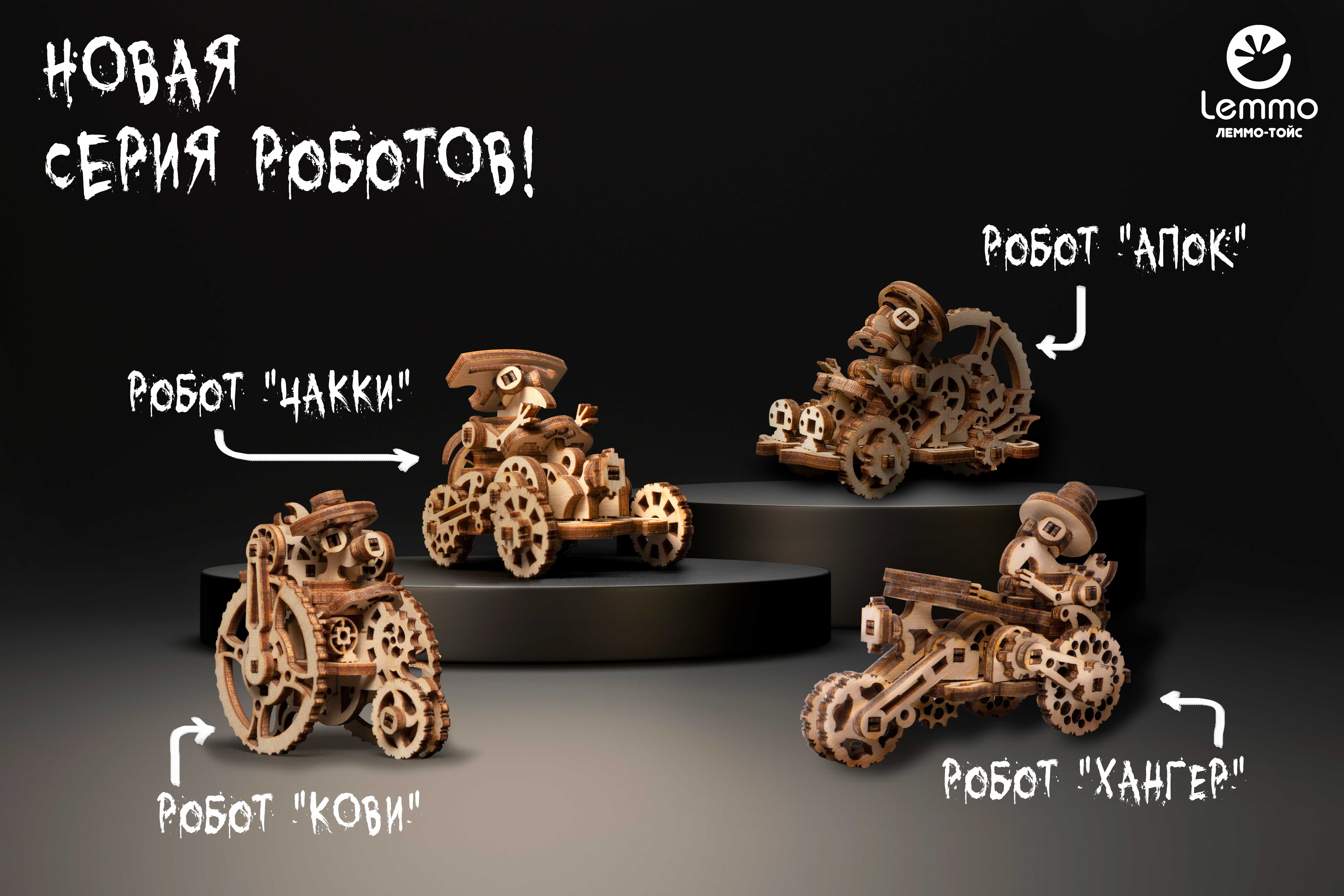Вы можете собрать целую серию деревянных роботов Леммо Крипики. Всего 4 вида: Апок, Хангер, Кови и Чакки.