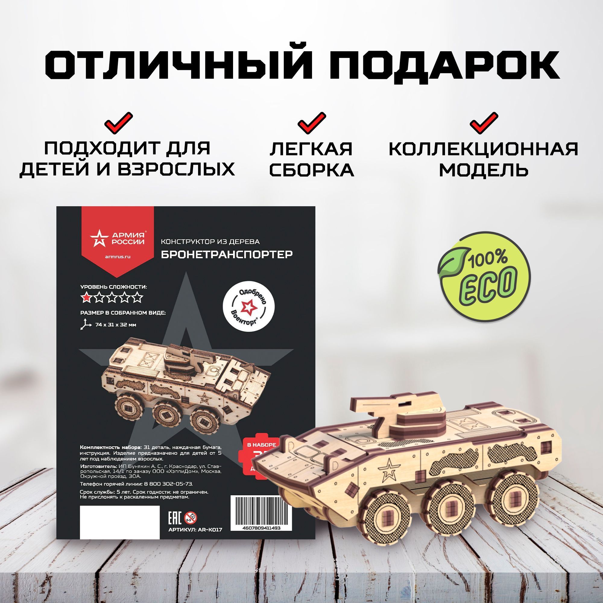 Деревянный конструктор, сборная модель Армия России БТР
