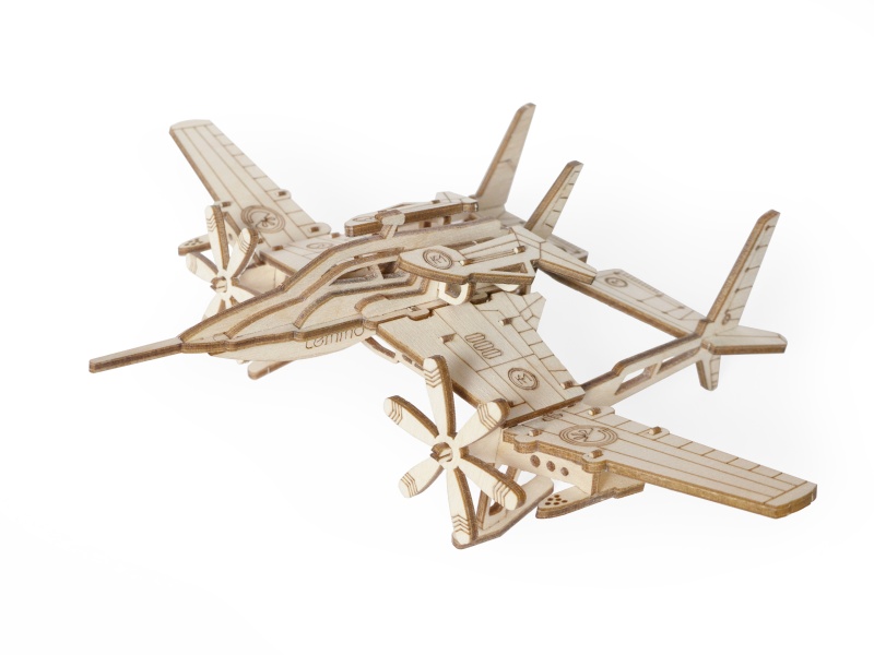 Собранную модель из дерева можно раскрасить любыми красками, карандашами или фломастерами. Она достаточно крепкая для игры или же можно просто поставить на полку как сборную модельку. У собранного самолета вращаются винты.