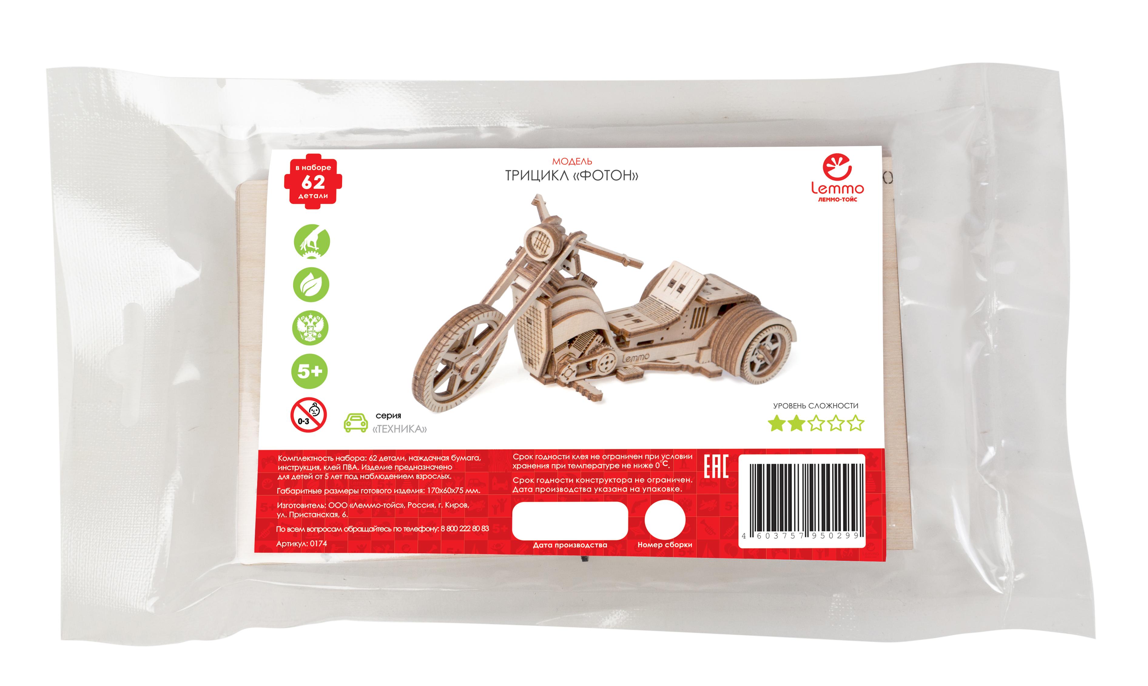 Деревянный конструктор и сборная модель из дерева мотоцикла «Трицикл Фотон» от фабрики деревянной игрушки «Леммо» для детей и взрослых. Все детали выполнены из качественной древесины и имеют сильный насыщенный запах дерева. Готовы к сборке.