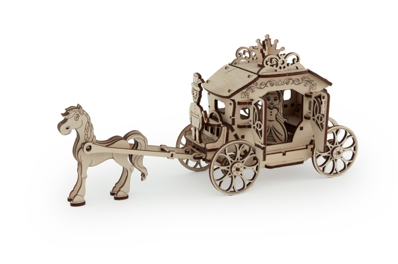 В набор входит фигурка лошади, кучера и принцессы. У собранной деревянной кареты вращаются колеса, открываются дверцы кареты.