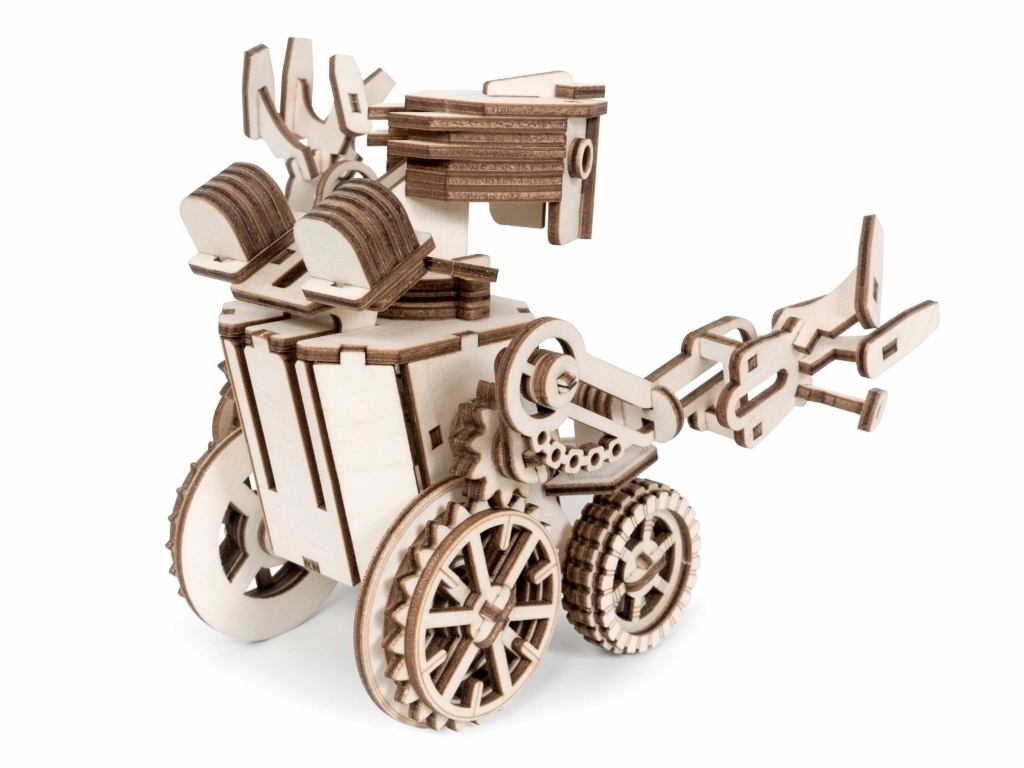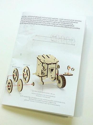 Все детали выполнены из качественной древесины и имеют сильный насыщенный запах дерева. Наборы укомплектованы клеем ПВА и наждачной бумагой. Любой конструктор после сборки можно раскрасить акриловыми и гуашевыми красками, но даже без этого в результате получается полноценная красивая игрушка с подвижными элементами.