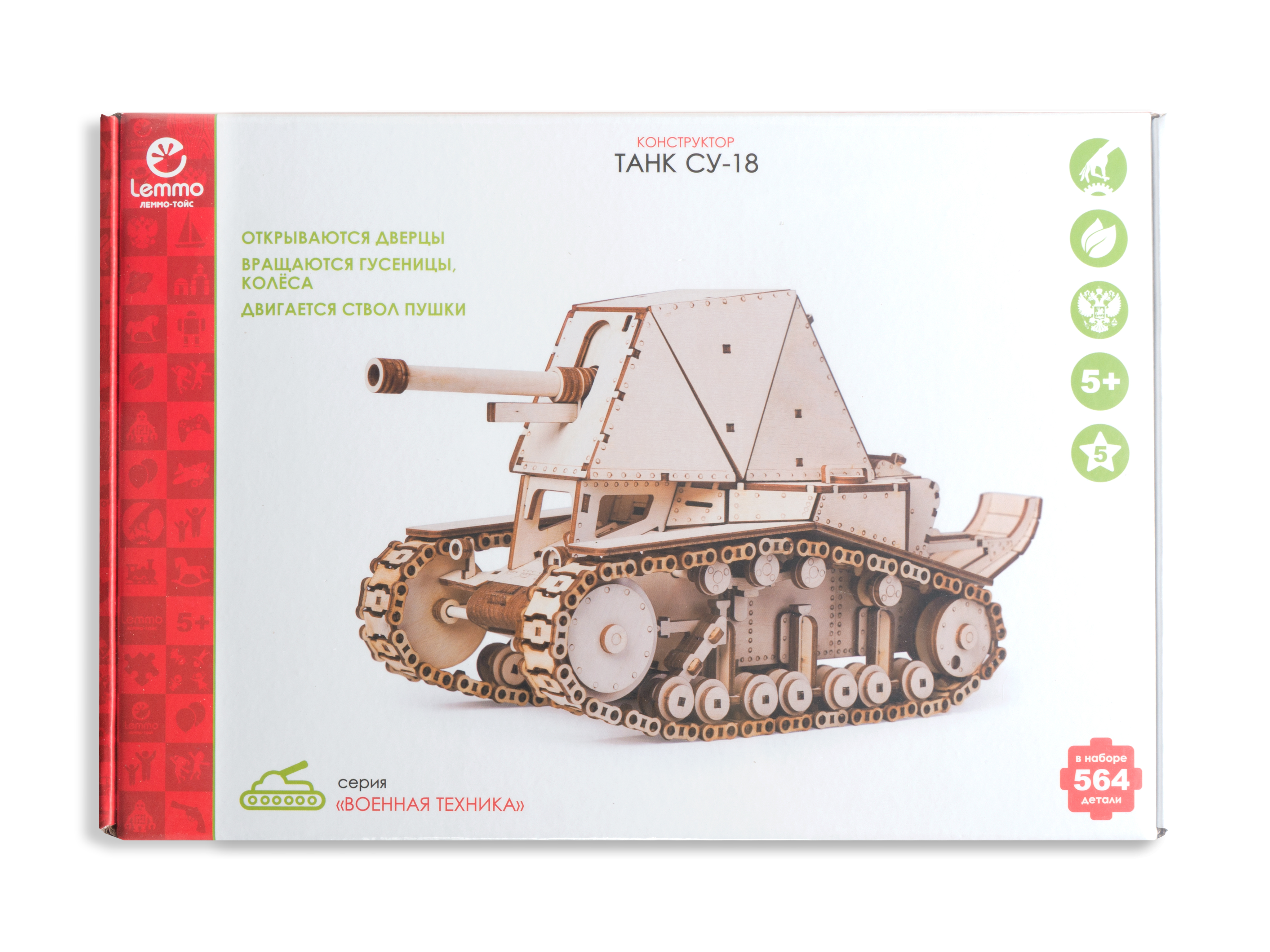 В этом наборе Танк Леммо подвижный СУ-18 очень много мелких деталей, процесс сборки потребует много вашего времени и внимания, но в результате у вас получится довольно большой и подвижный танк с вращающимися гусеницами и вращающимся дулом, кроме того у танка открываются дверцы. Это отличный подарок для мальчишек и их пап, а так же для любителей моделизма.