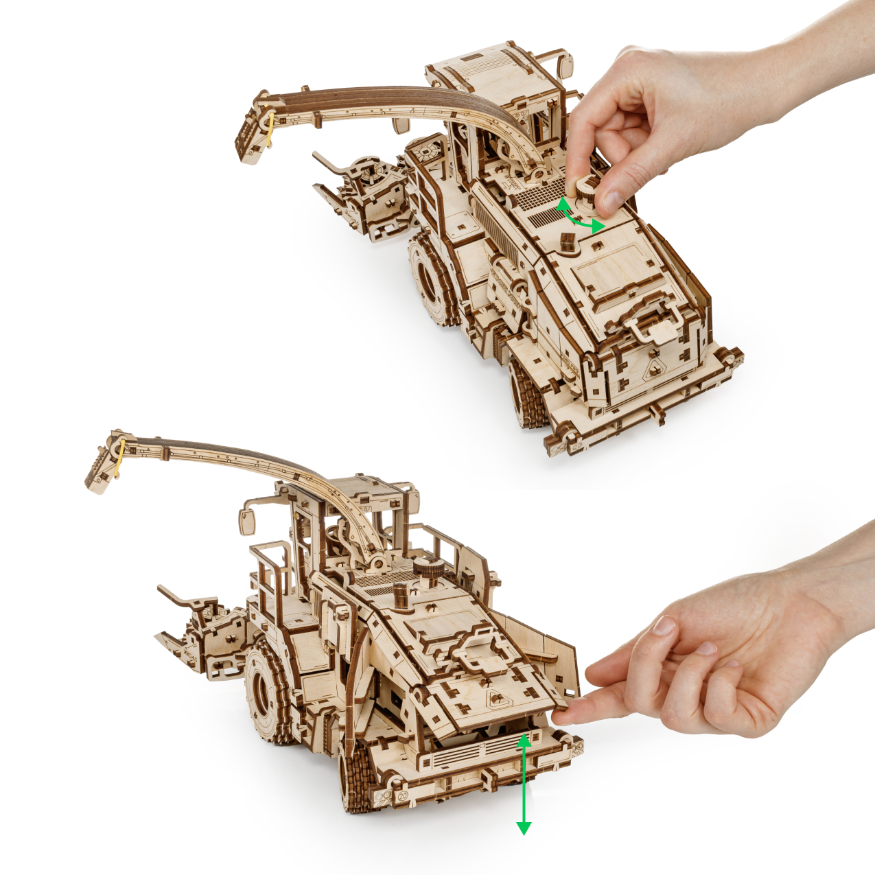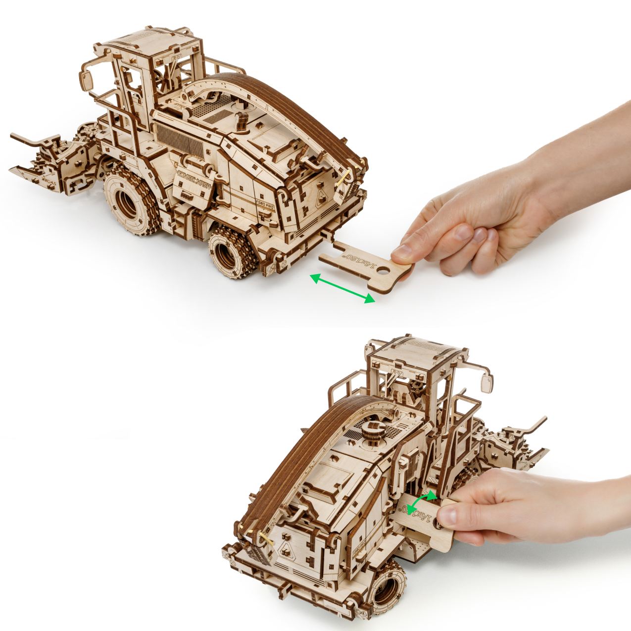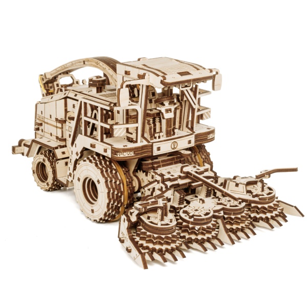 Деревянная механическая сборная модель EWA Комбайн с жаткой FS80 PRO для грубостебельных культур с мотором - отличный подарок на любой праздник для ребенка, и для взрослого человека, который увлекается конструированием и моделированием.