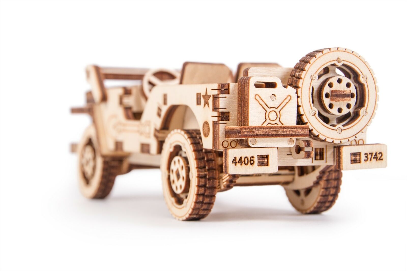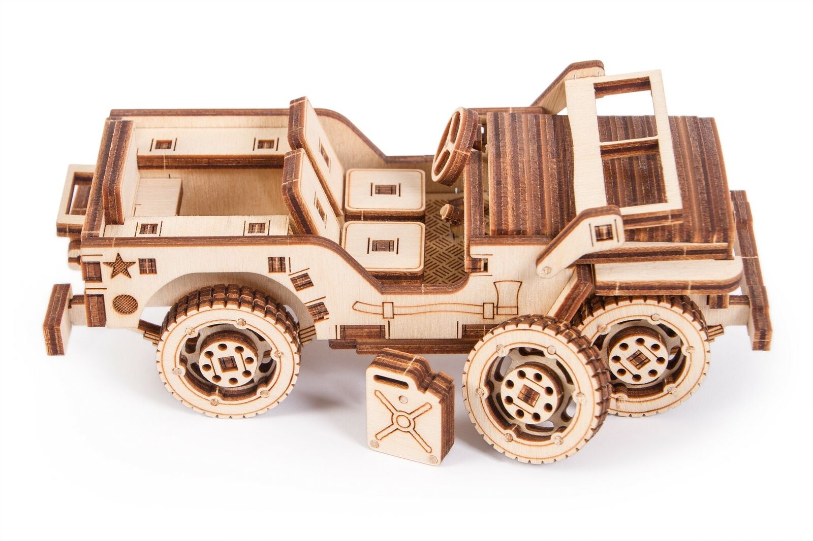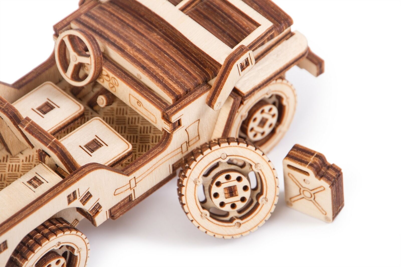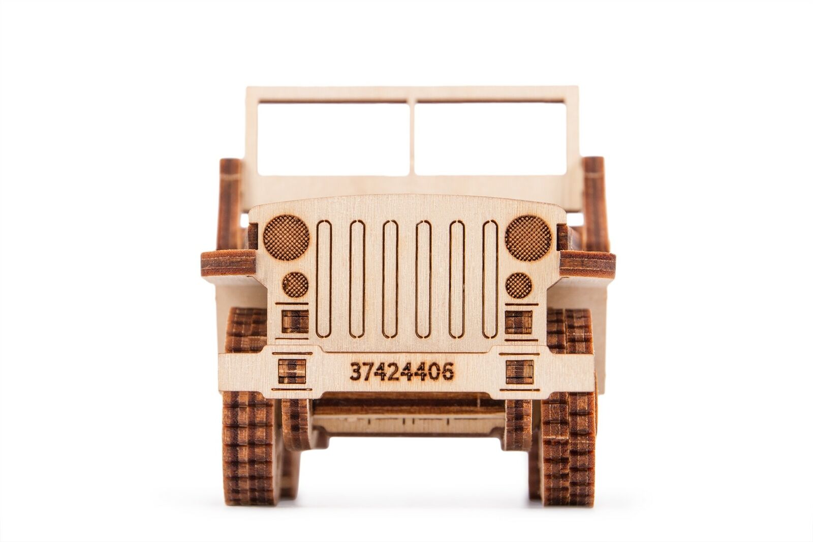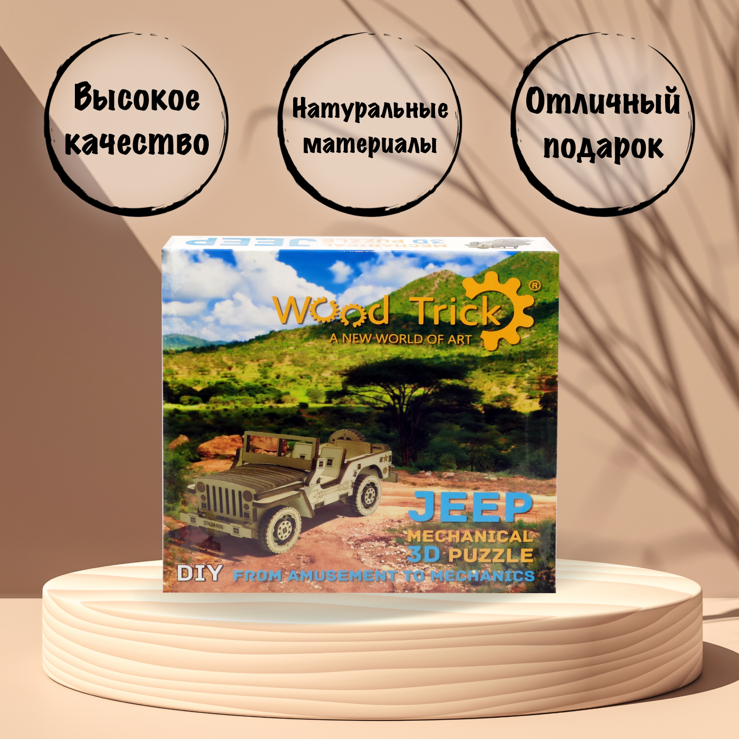 Конструктор Wood Trick Джип можно довольно легко собрать минут за тридцать, ведь он совсем небольшой и поместится на ладошке. А еще он поместится в деревянном конструкторе Прицеп автовоз, к которому можно собрать целый автопарк из мини машинок: Джип сафари, Кабриолет и Квадроцикл.