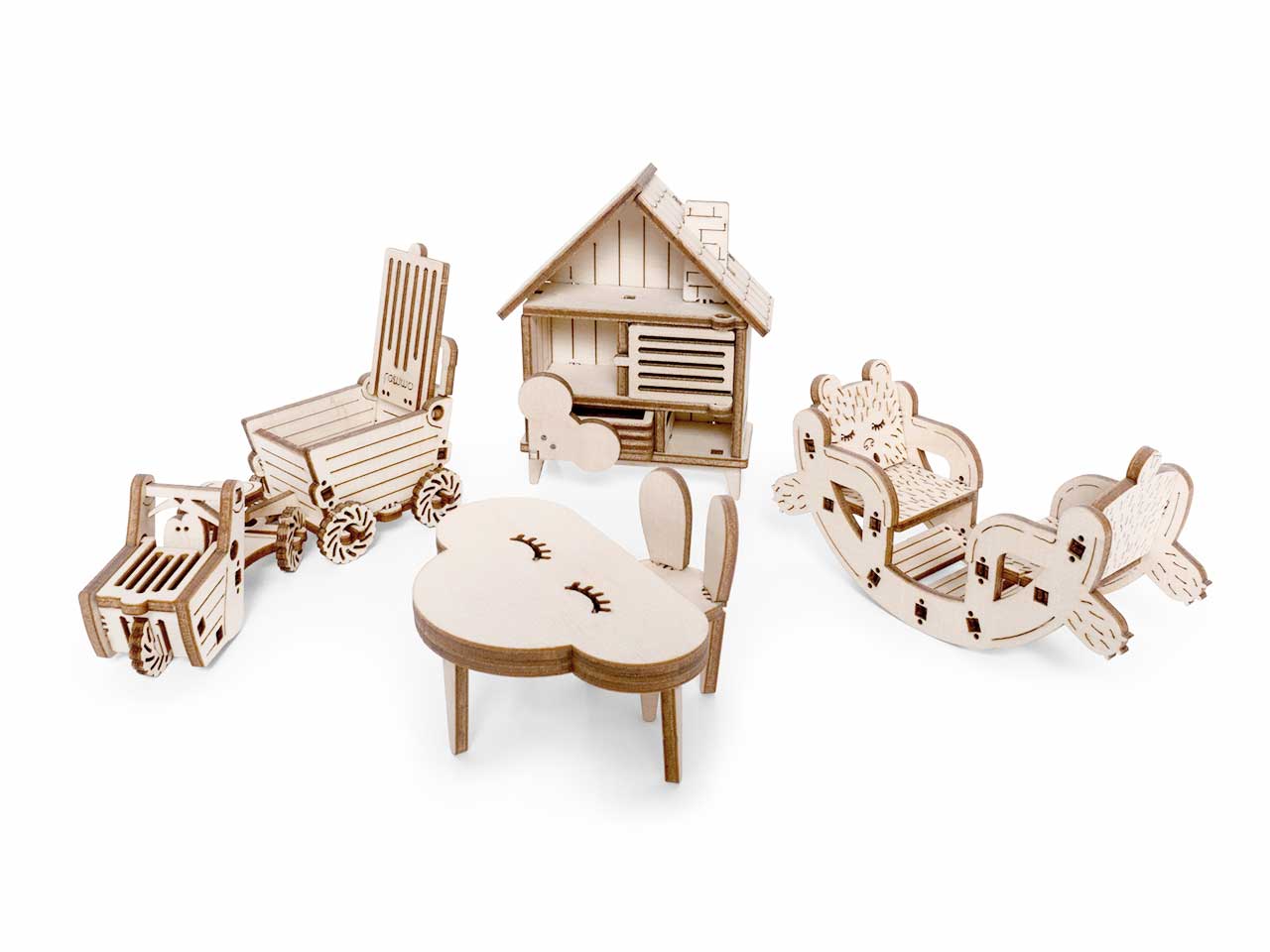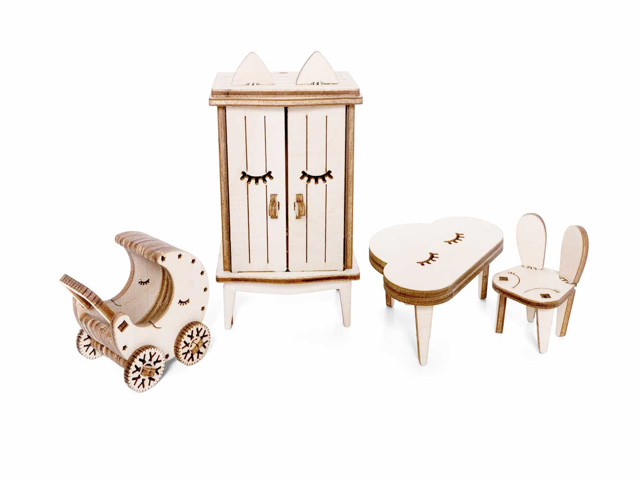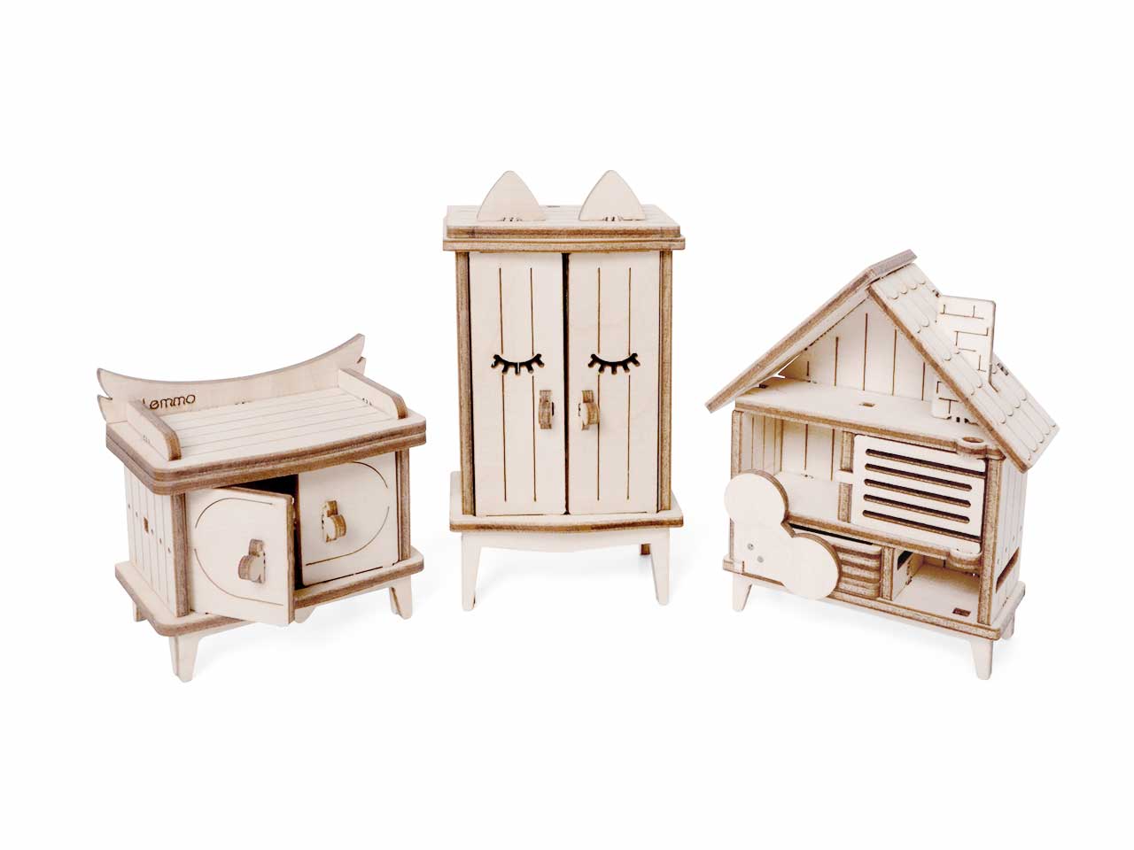 Открываются дверцы шкафчиков, крутятся колёса. Наборы подходят для кукольного дома «Венеция» и «Лофт». При желании мебель можно раскрасить акриловыми красками. Так же можно приобрести наборы мебели «Ванная» и «Бытовая техника».