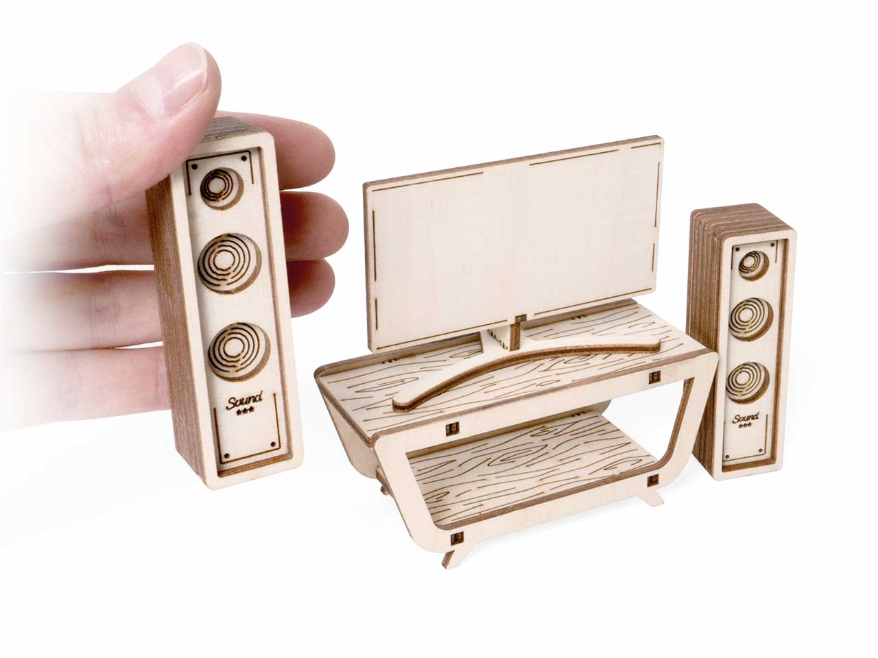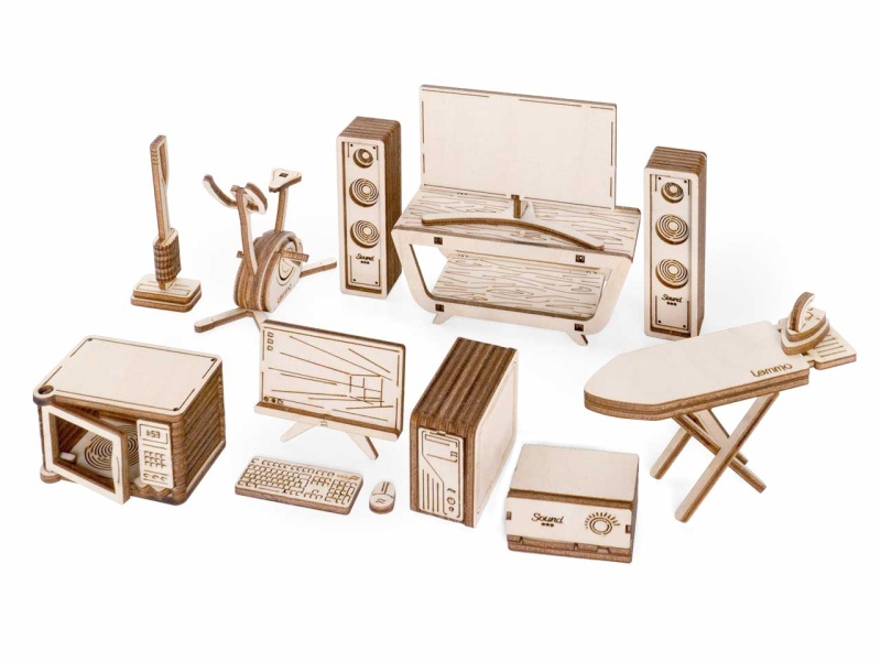 Крутятся педали тренажёра, вращается щётка пылесоса, открывается дверца микроволновки, раскладывается гладильная доска. Наборы подходят для кукольных домов «Венеция» и «Лофт». При желании мебель можно раскрасить акриловыми красками. Так же можно приобрести наборы мебели «Детская» и «Ванная»!