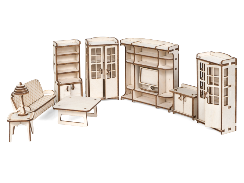 Мебель выполнена из березовой фанеры, даже небольшие элементы, такие как ручки на дверцах. Все детали собираются с небольшим количеством клея, просто вставляются в пазы, крепление очень прочное и надежное.