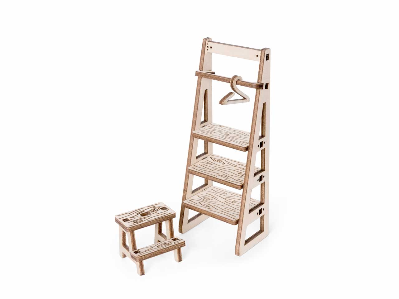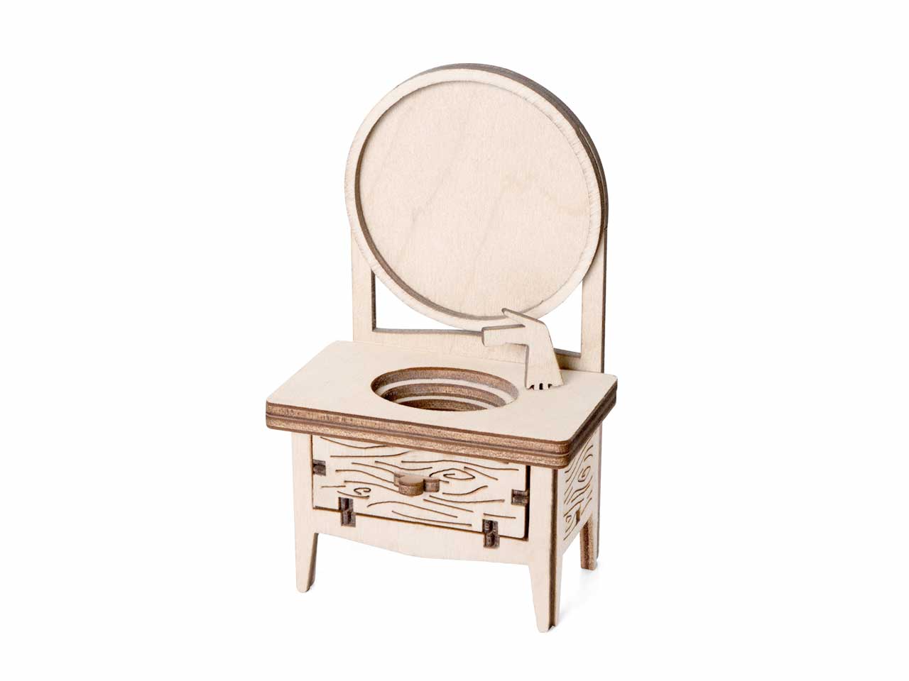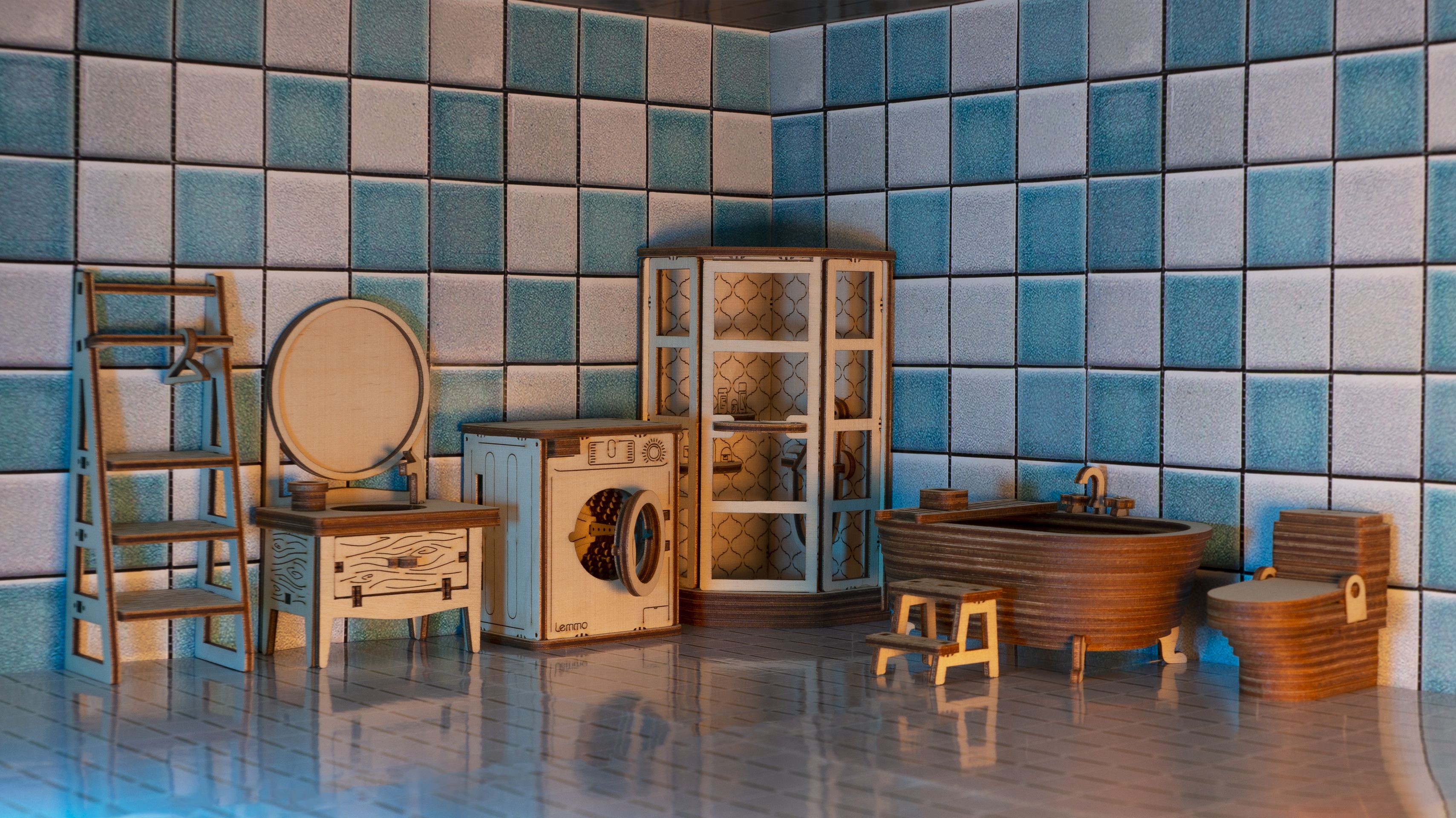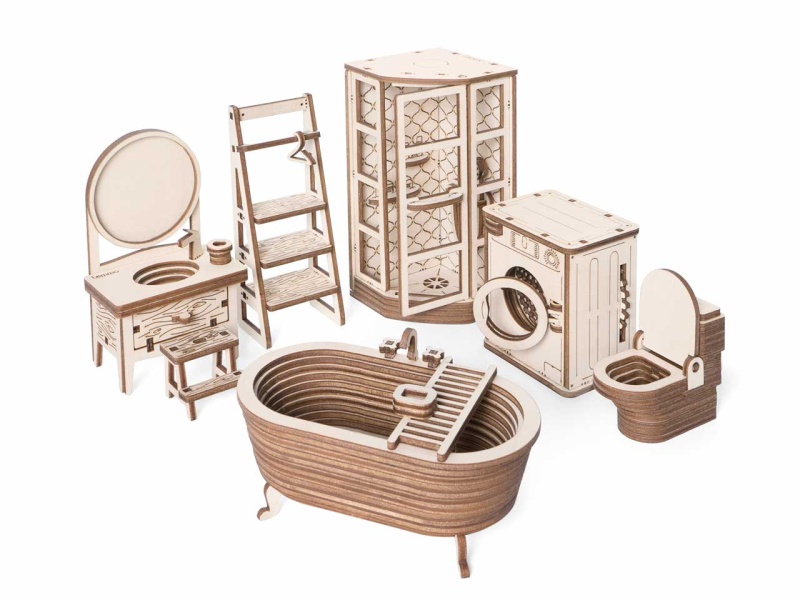 Открываются дверцы, выдвигается ящик. У стиральной машинки открывается отсек для порошка, крутится барабан, открывается дверца. Наборы подходят для кукольных домов «Венеция» и «Лофт». При желании мебель можно раскрасить акриловыми красками. Так же можно приобрести наборы мебели «Бытовая техника» и «Детская».