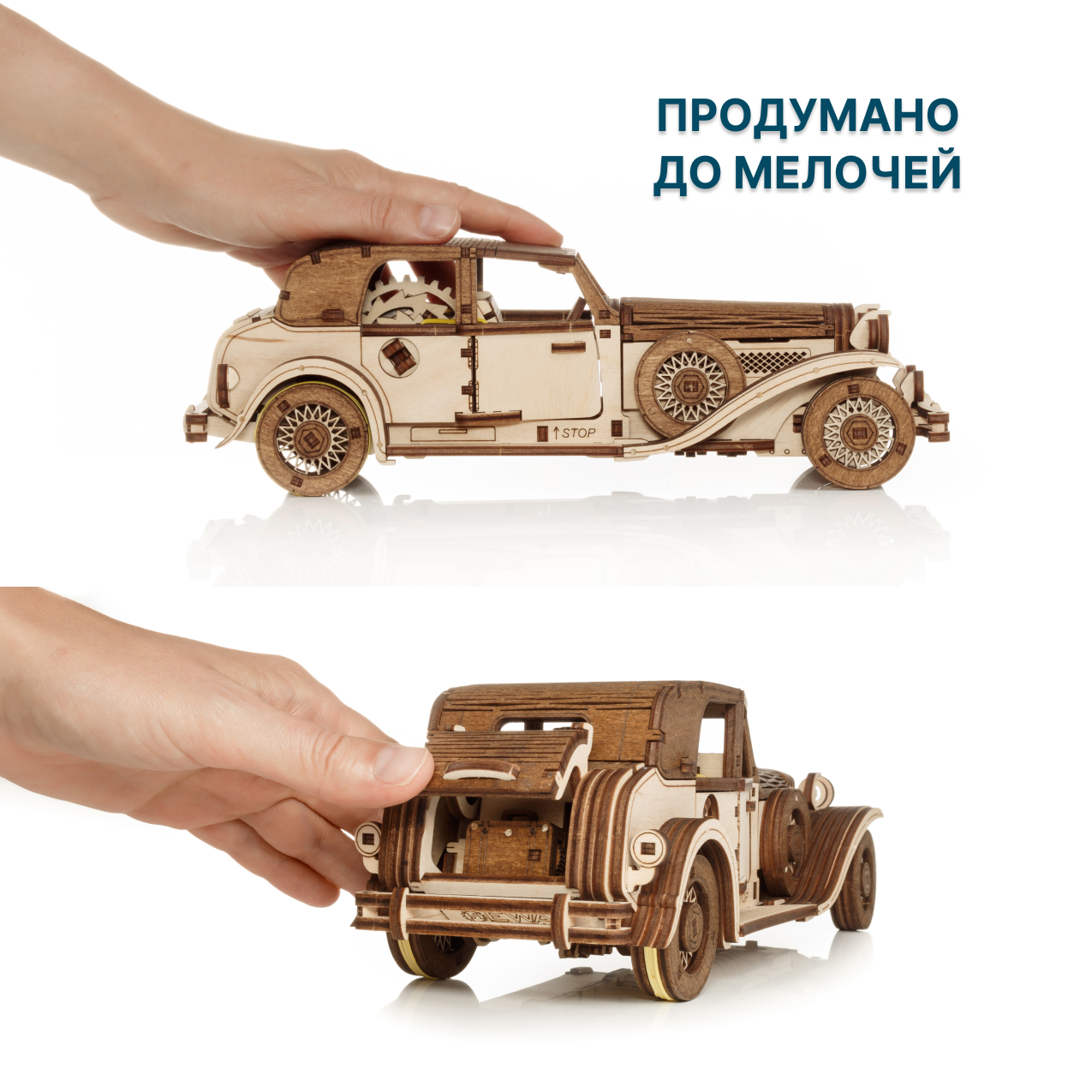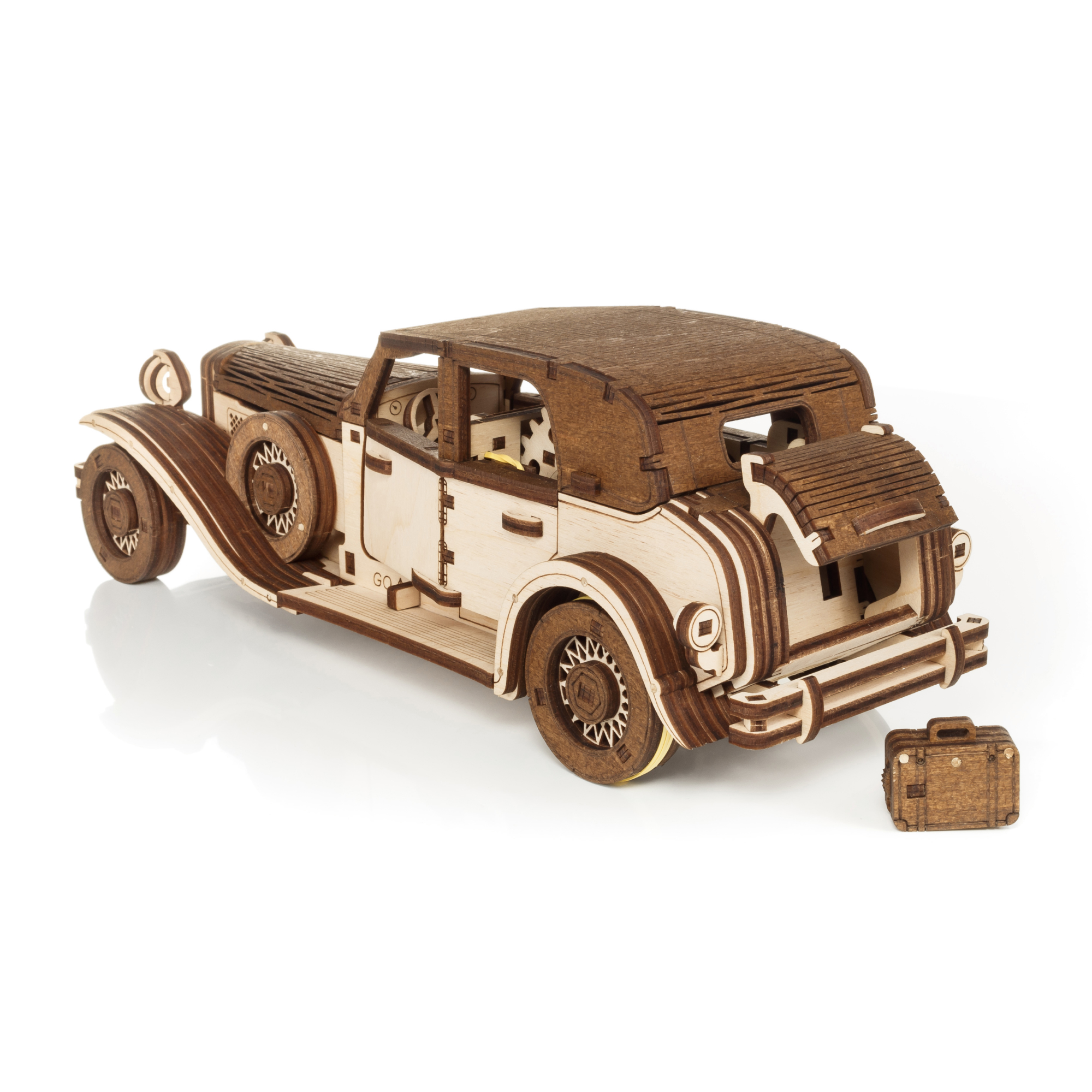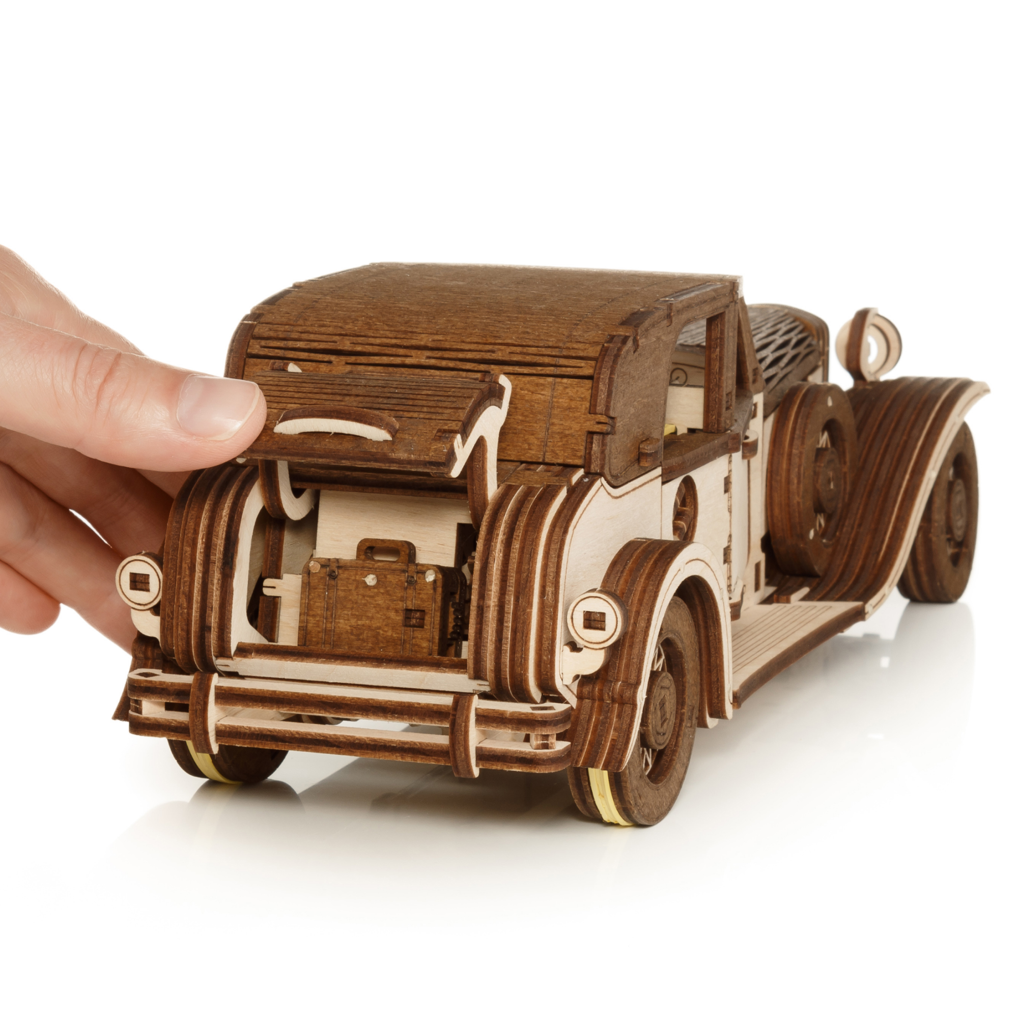 Деревянная сборная модель автомобиля оснащена как пружинным мотором, так и инерционным механизмом, которые приводят его в движение после сборки. Его можно завести с помощью ключа, который помещается в багажнике, а также путем оттяжки автомобиля назад. Ретро-автомобиль из дерева прекрасно детализирован, в нем открываются двери, капот и багажник.