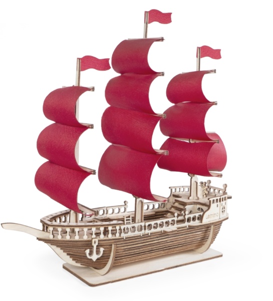 Паруса у модели красного цвета, сделаны из приятной на ощупь ткани. Корпус судна после сборки можно раскрасить акриловыми или гуашевыми красками!