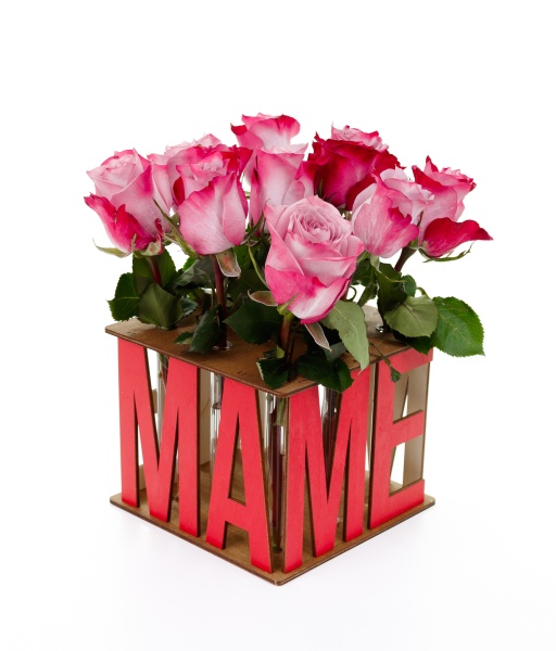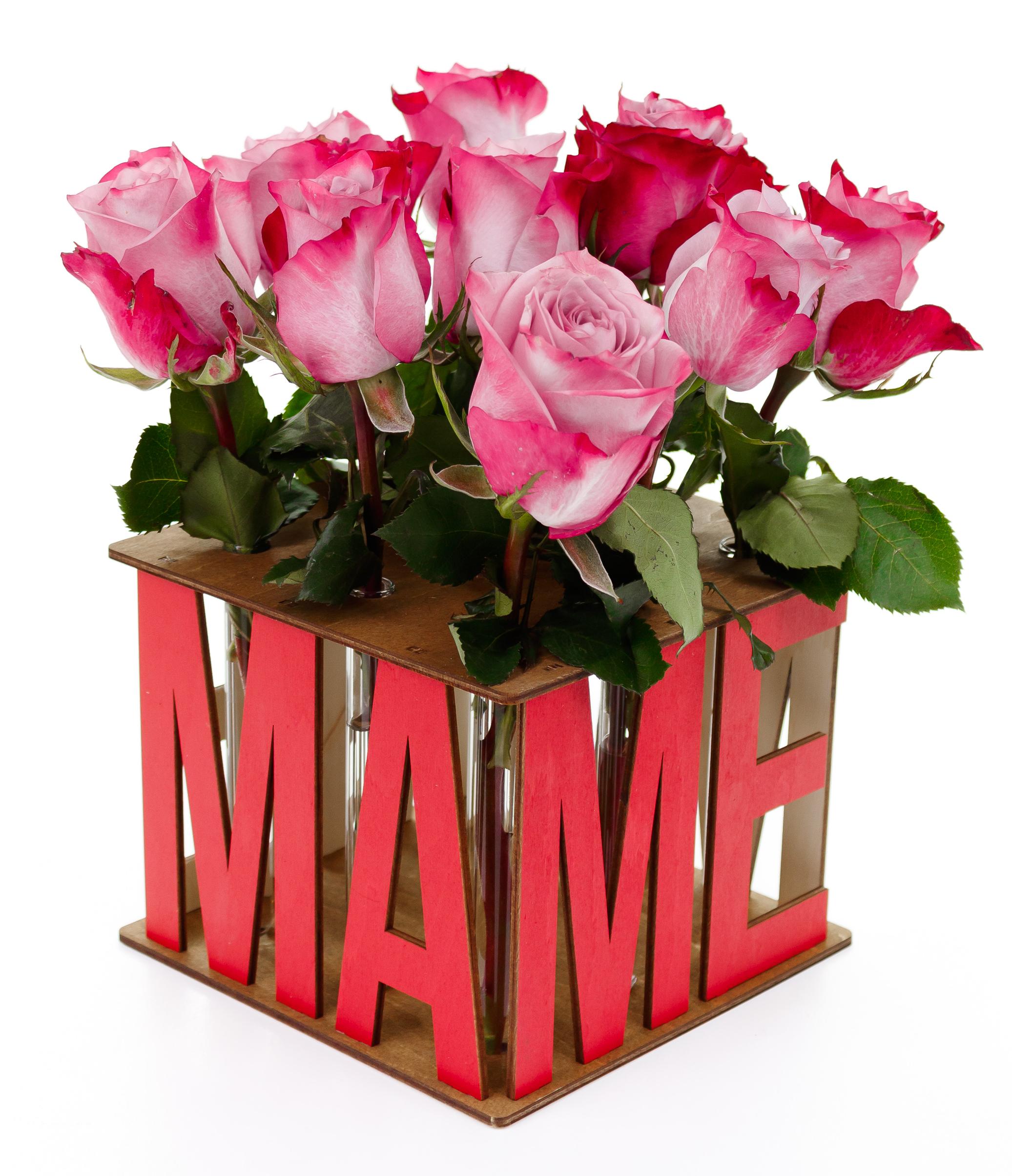 Креативная и оригинальная интерьерная ваза с колбами для оформления подарка любимой маме. Ваза с пробирками может быть хорошим подарком для мамы на день матери или любой праздник. Стильное сочетание деревянной основы и стеклянных колб с надписью "Маме" создает оригинальную цветочную композицию для подарка, которая не только порадует маму, тещу или свекровь, но и станет стильным элементом для декора и интерьера дома. Подарочный набор может стать оригинальным подарком для девушки на выписку из роддома или для женщины на день рождения сына или дочки.